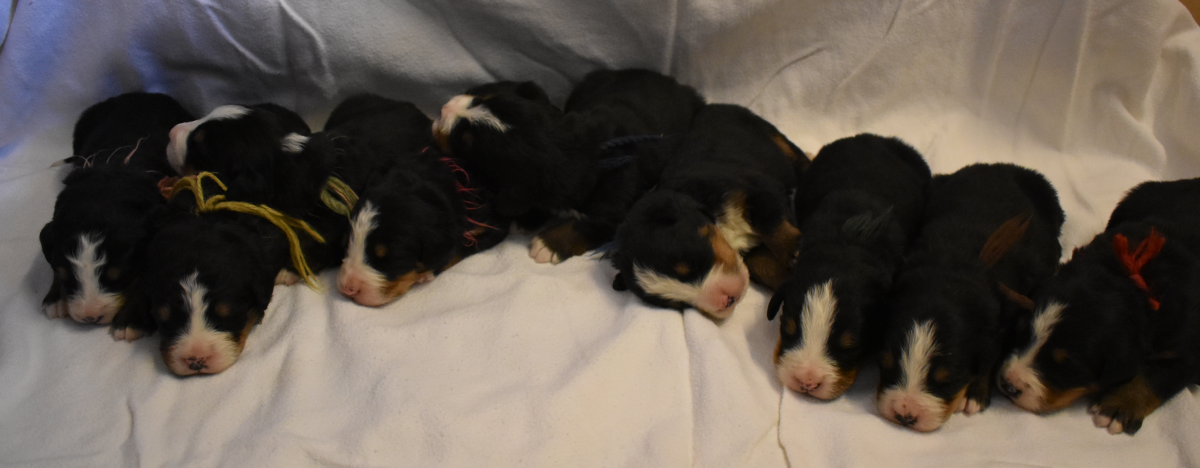 | Wir haben nochmal wunderschöne gesunde Welpen bekommenWicki vom Wiesenbachtal und Hieronymus von den Albmühlen haben am 2. April 2019 ihren nächsten Wurf bekommen. Es sind 4 Rüden und 5 Hündinnen. Mutter und Welpen geht es sehr gut. Alle neun Bärchen zusammengekuschelt Die fünf wunderschönen Mädels